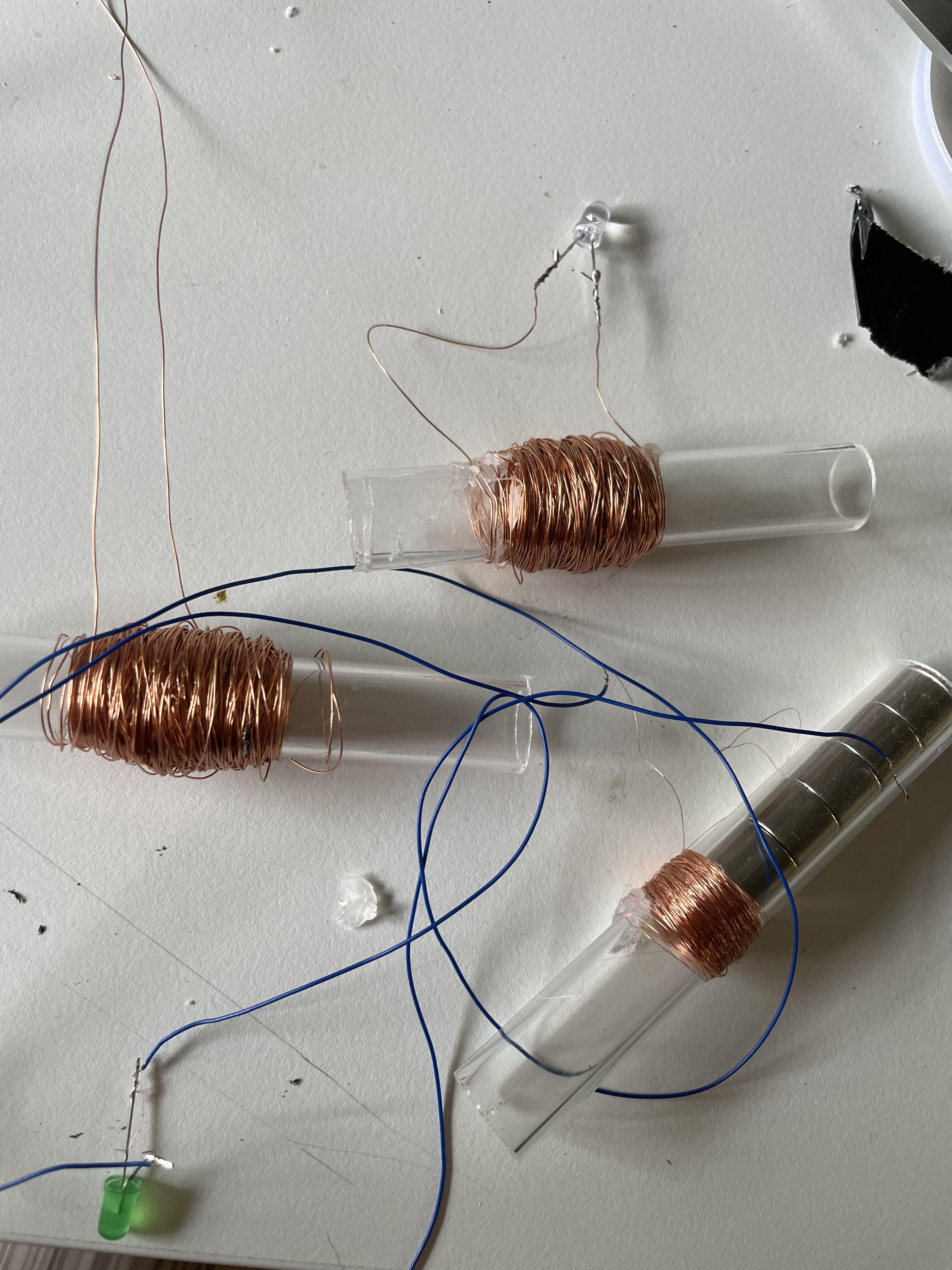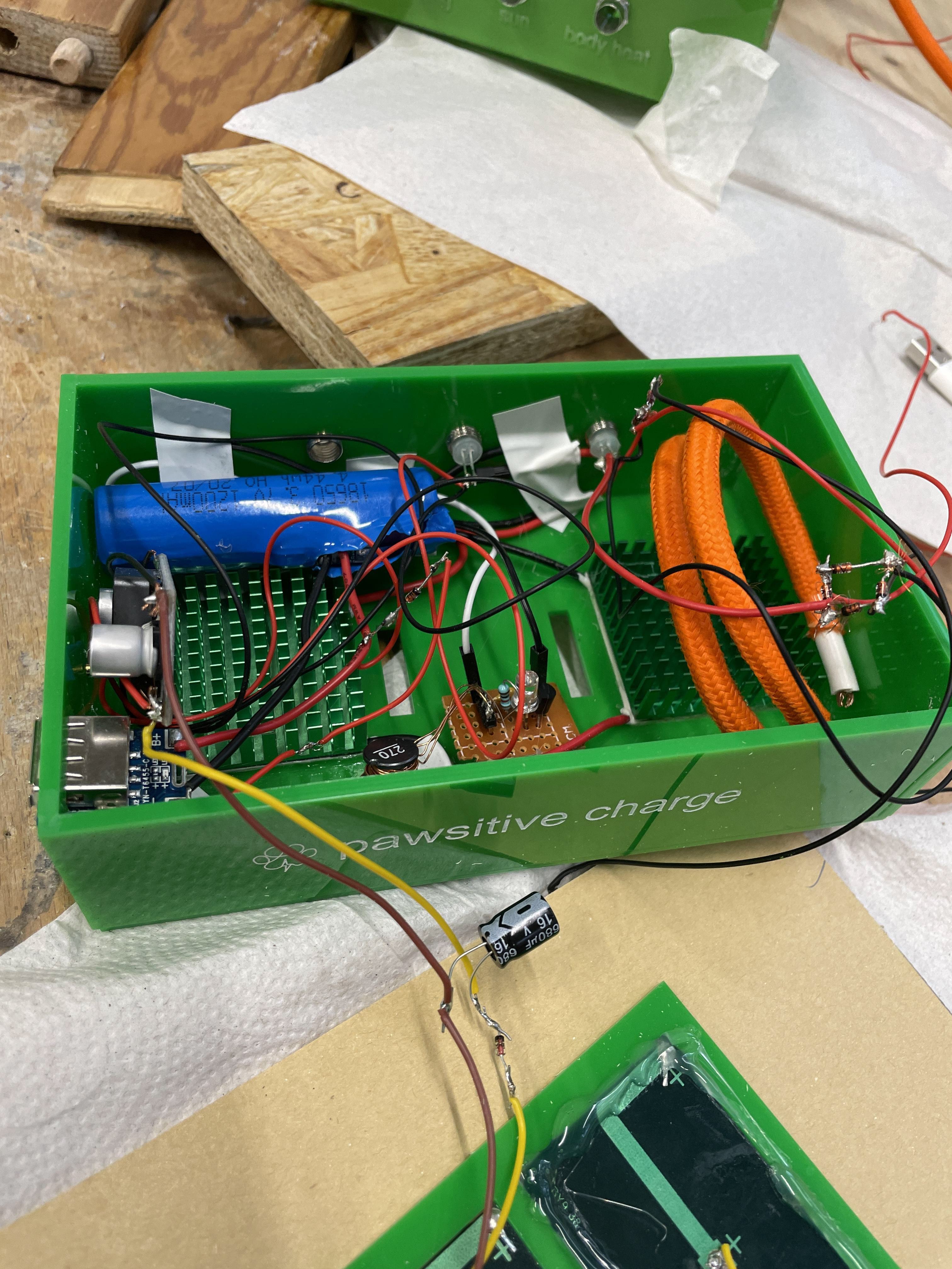 all 3 devices are producing energy to lighten up a LED, symbolizing energy generation: Pawerbank is using piezo elements in the shoes and solar panels charging a battery to charge your phone Leash creating energy using a dynamo Perpetual Wagging device is creating energy using a Faraday generators: copper wire and magnets